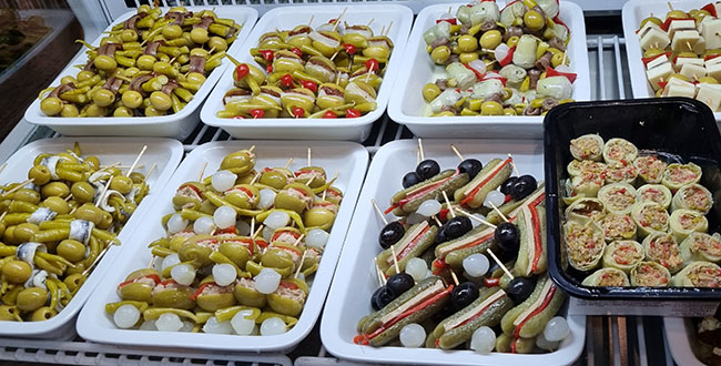 Después de la convulsión musical, llegamos al espectáculo gastro en el que el vestíbulo del auditorio se convierte en fascinante escenario para deleitarte con tentaciones tan apetitosas como las celebérrimas gildas y banderillas de Bombas, Lagartos y Cohetes de Vallekas. Placer para los sentidos gustativos en mayúsculas, desde sus pinchos de aceitunas gordales sevillanas rellenas de bonito, jamón o lomo ibérico, hasta sus pepinillos originarios de La Rioja rellenos de bonito y pimiento rojo, anchoa, bacalao, salmón… con cebolletas y aceitunas verdes o negras.