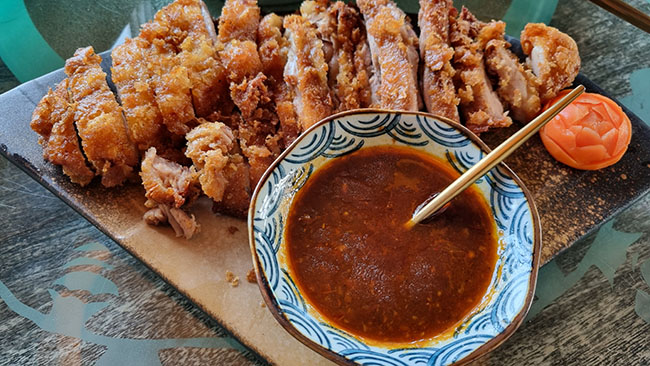 Como guarnición, arroz cantonés salteado con tiras de ternera, zanahoria, brotes de soja y pack choi en salsa de soja; o tallarines al estilo shanghainés, salteados también con bok choy, pimientos verdes y rojos, y picada de cerdo ibérico laqueado en salsa de soja.