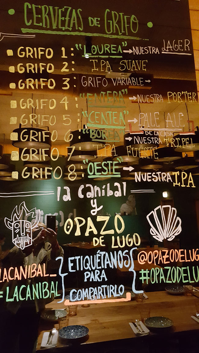 Todo gracias al empeño compartido por Javier Vázquez, tabernero de pro y alma mater del restaurante familiar O Pazo de Lugo, anexo a La Caníbal, y el entusiasta y polifacético Luis Vida, de hacer ‘su’ primera cerveza artesanal. Y lo consiguieron con Centea, una pale ale con centeno elaborada en Dougall’s (Cantabria), a la que se han sumado otras sorprendentes maravillas como la pils alemana Lourea o la IPA Oeste realizadas en colaboración con los hermanos Sanfrutos en Segovia, la tripel belga Bórea, madurada con roble pasado por albariño y elaborada en Yakka (Murcia) … hasta un total de ocho cervezas de grifo. No en vano se declaran “cerveceros nómadas”. Bajo un estilo muy singular, siempre llevan a cabo sus proyectos en fábricas de amigos. Y ante la duda, déjate llevar por Borja Selma, su beer sommelier. Seguro, seguro, que acierta a la primera con tus gustos.