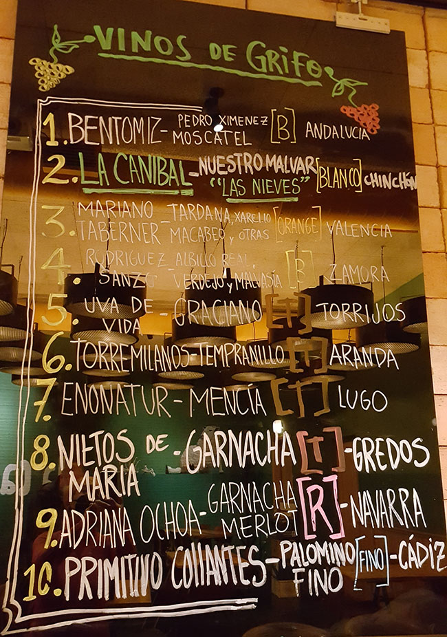 Cuatro blancos, cuatro tintos, más un rosado y un fino de terruño a granel, procedentes de pequeñas parcelas, que sus colegas viñadores envasan en exclusiva para ellos e incluso te puedes llevar a casa en tu botella rellenable. Desde el blanco Las Nieves, pensado en pleno confinamiento y creado en colaboración con Marc Isart en Chinchón (Madrid), procedente de viñas de 80 años de malvar; o el de albillo y verdejo de viñedo eco de 60 años, con un año en barrica, producido por Javier Rodríguez Sanzo en Zamora; hasta tintos como el espectacular tempranillo de Aranda elaborado por la savia nueva de Torremilanos. Un plantel de verdaderos tesoros en manos del sumiller Alberto Ruffoni, un crack para tal disfrute. De hecho han conseguido el prestigioso galardón de ‘Mejor bar de vinos alternativos de España’ otorgado por la International Wine Challenge.