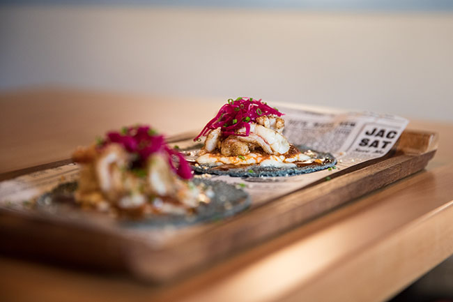 Tacos de oreja y sepia con salsa de chile habanero, de bacalao crujiente con salsa de romescu de chile mulato y aguacate, de carrillera con salsa de chile poblano y jardín, son un buen ejemplo de este nuevo concepto de taquería, donde también podrás degustar tacos más tradicionales como los de cochinita Pibil con X’nipec, una salsa originaria de la península del Yucatán; los del Gobernador con queso Oaxaca y polvo de kikos o los tacos al Pastor con cebolleta, piña y cilantro.